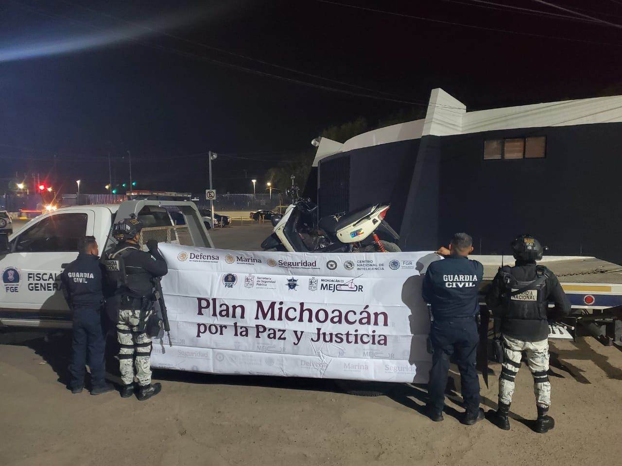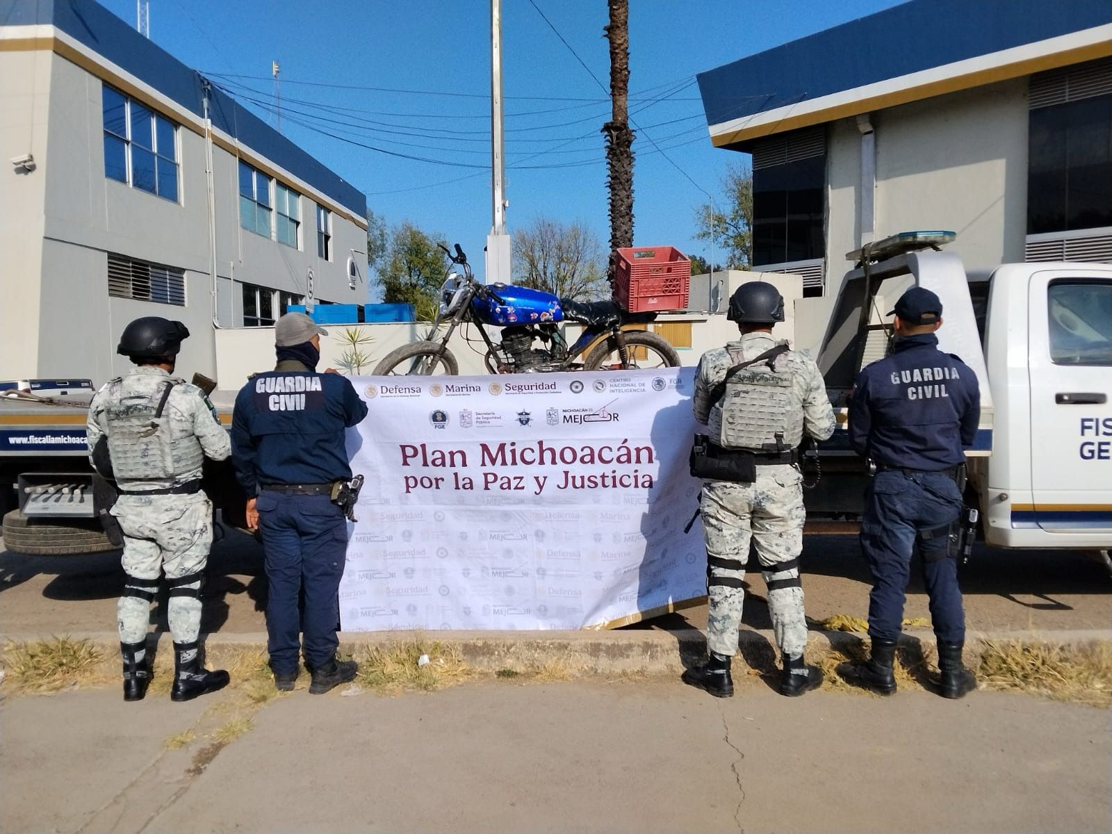 Primeramente fue asegurado Julio César F. O., de oficio mecánico, quien conducía una motocicleta, de la marca Italika, de color blanco, con reporte de robo vigente, justamente cuando circulaba por la Avenida Francisco I. Madero Poniente, de Morelia.