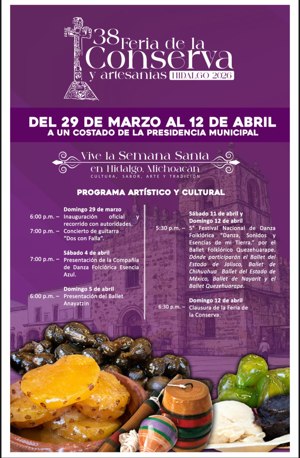 Morelia, Mich.- La Feria de la Conserva 2026 se realizará en Ciudad Hidalgo del 29 de marzo al 12 de abril, con la participación de más de 10 conserveros, informó la Secretaría de Turismo de Michoacán (Sectur), dependencia dirigida por Roberto Monroy García.