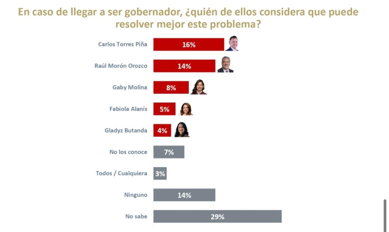 Hablando en materia de seguridad, son el 36% de los encuestados quienes aseguran que les gustaría que se resolviera primero el tema de la seguridad, y ahí es donde entra el actual fiscal Carlos Torres Piña, quien ha logrado acertar duros golpes a la delincuencia, y resolver algunos de los crímenes más complejos de Michoacán, mostrando así que tiene la capacidad de atender la principal demanda ciudadana.