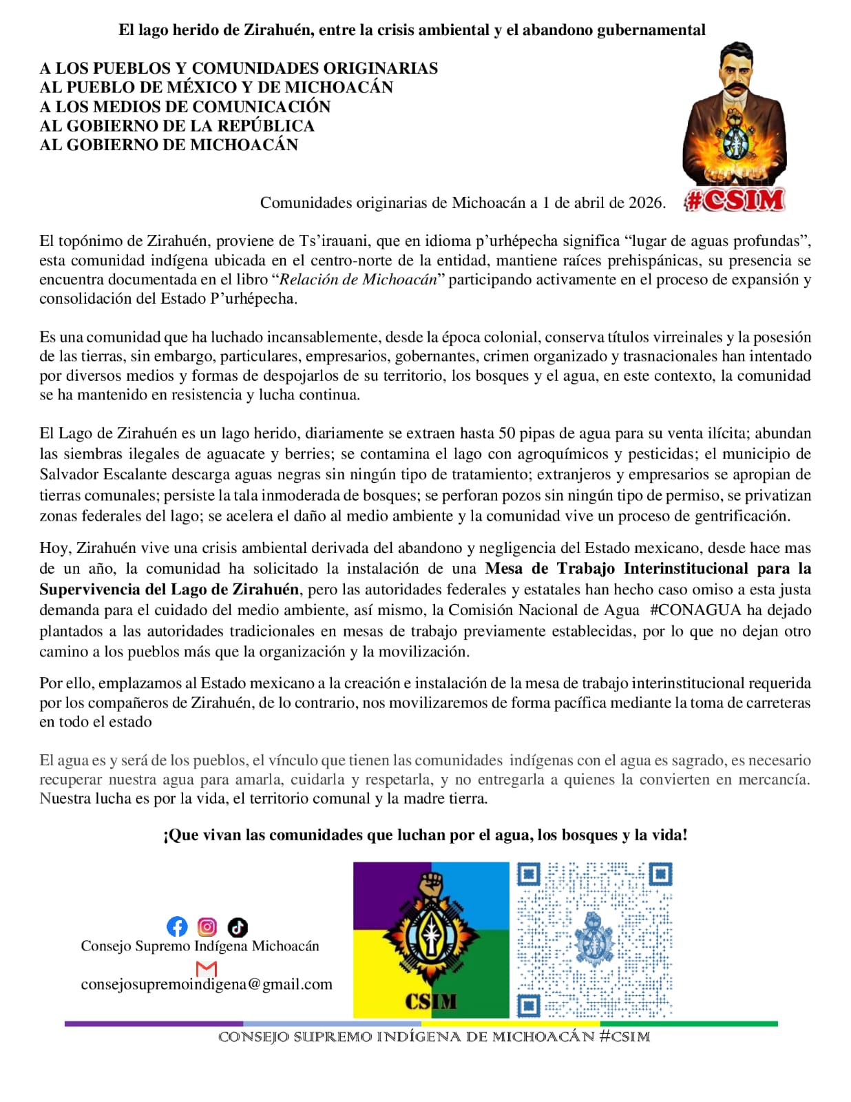 En cuanto al tema de la Comisión Nacional de Agua, CONAGUA "ha dejado plantados a las autoridades tradicionales en mesas de trabajo previamente establecidas, por lo que no dejan otro camino a los pueblos más que la organización y la movilización".