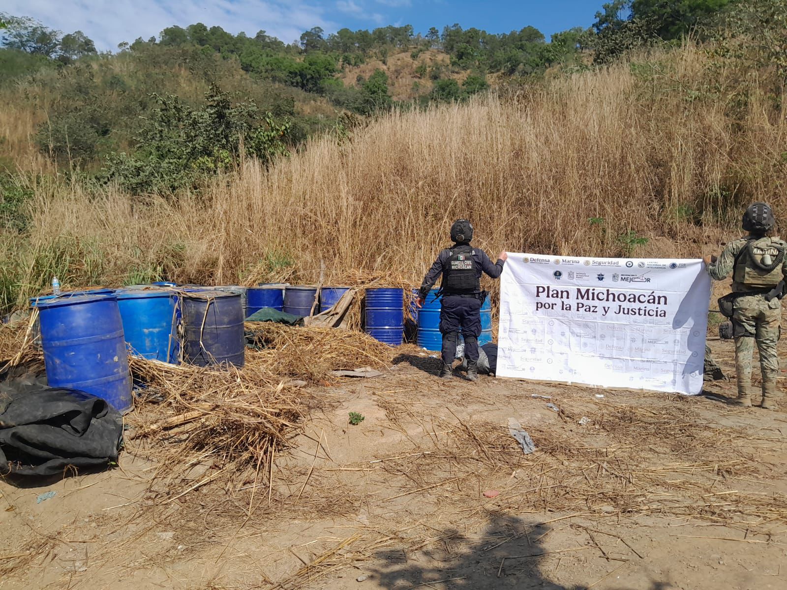Al respecto se informó que, mediante el recorrido interistitucional, en el marco del Operativo Michoacán por la Paz y la Justicia, los oficiales transitaban por la brecha que va de la tenencia de La Placita a La Escondida, ahí localizaron un sitio donde había varios artículos que se usan para la fabricación de droga sintética.