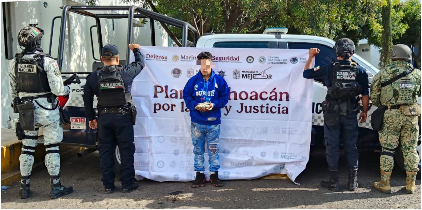 La primera detención se llevó a cabo en la colonia Salinas de Gortari, de Jacona, ahí se aseguró a Jesús Eduardo G. G., de 18 años de edad, que tenía entre sus pertenencias tres bolsitas que contenían en su interior una sustancia granulada con las características a la droga conocida como metanfetamina.