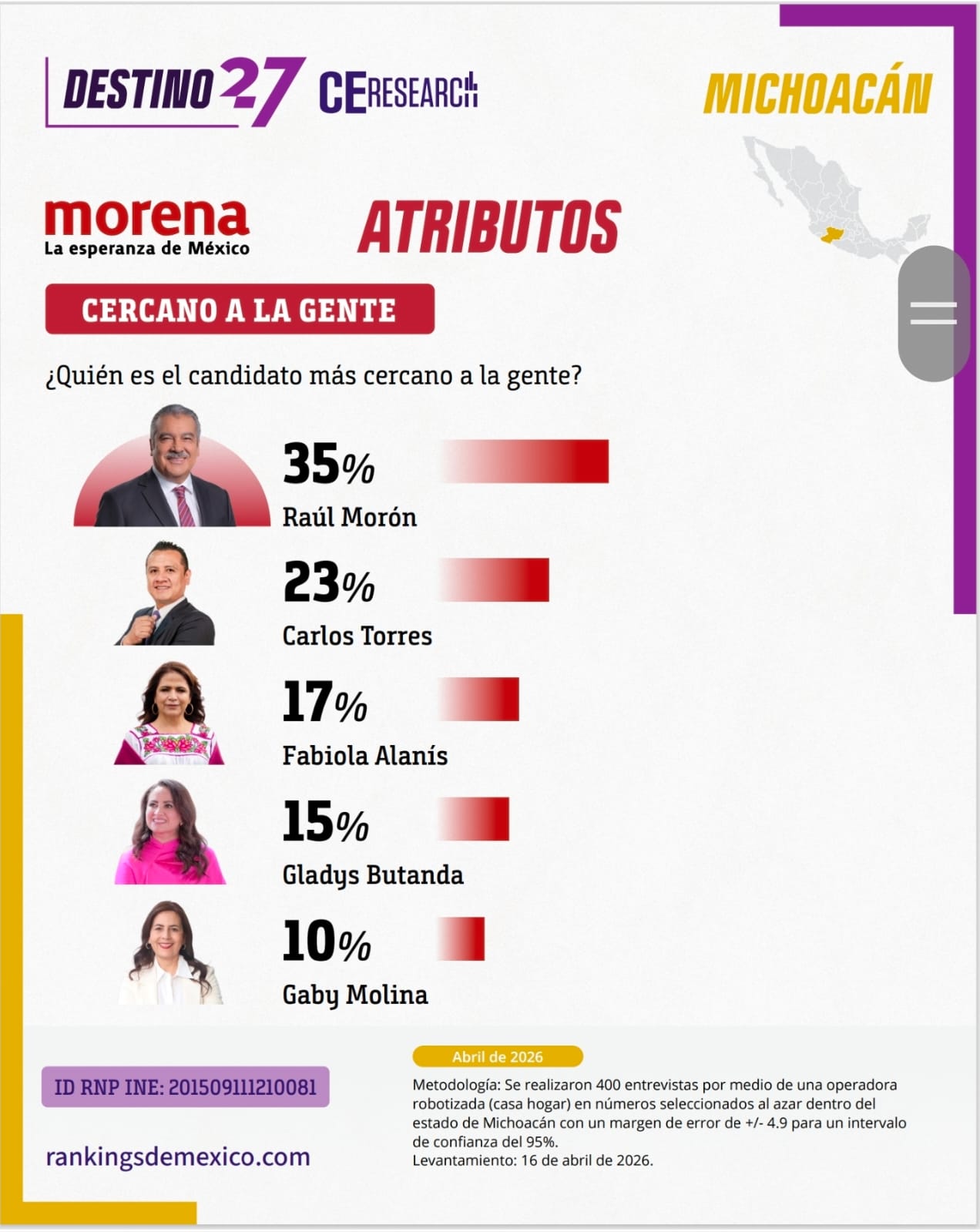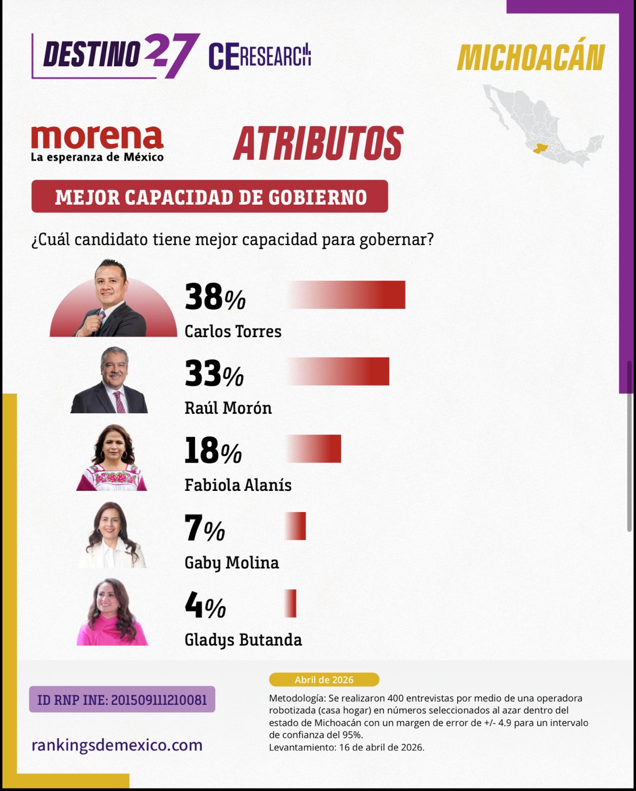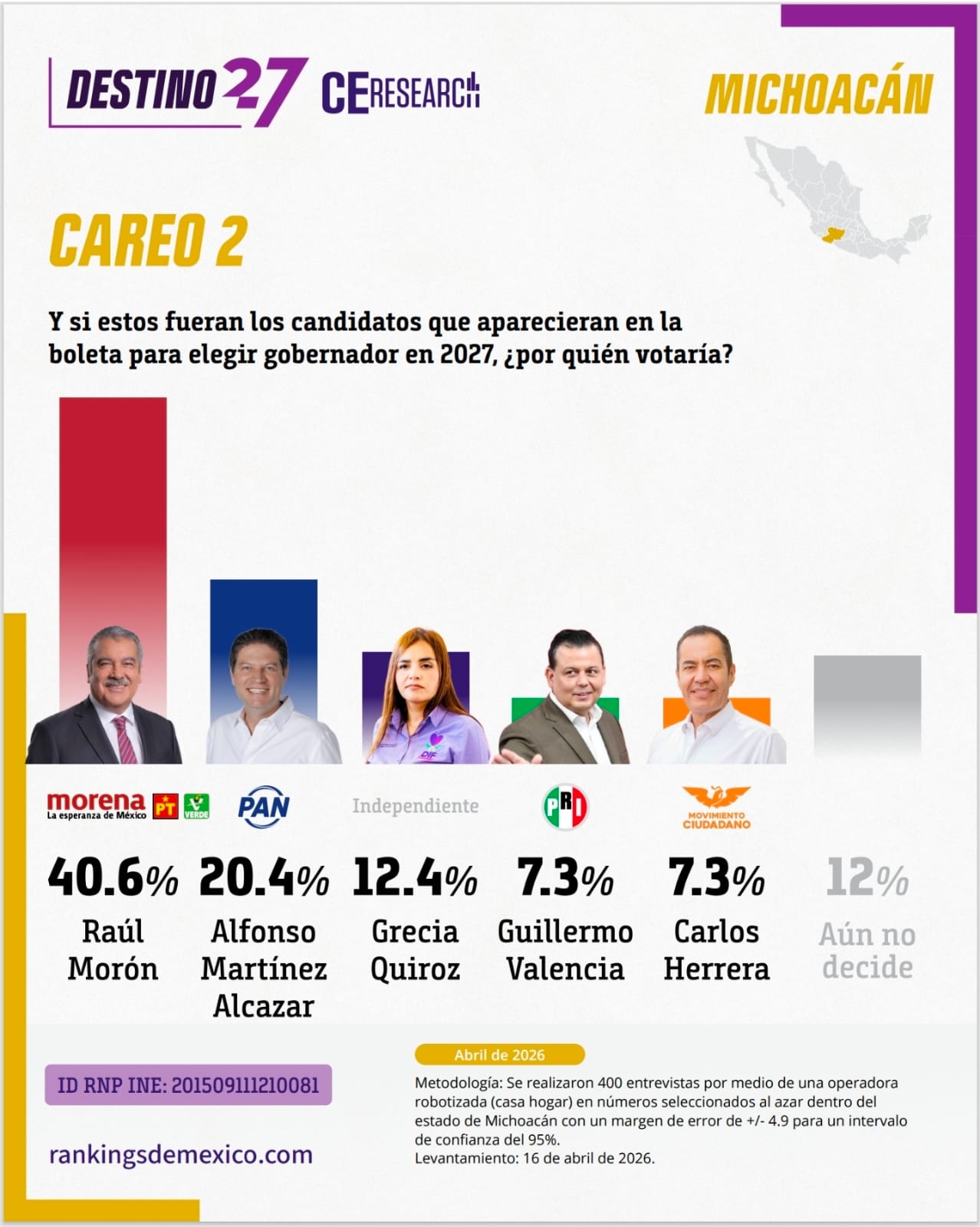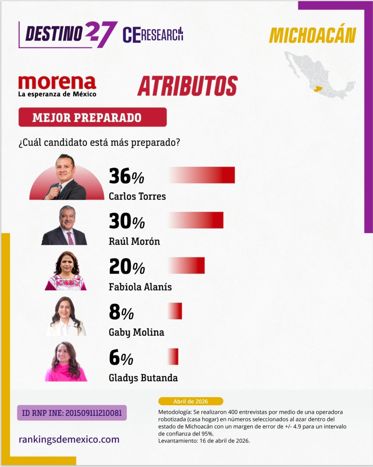Una encuesta estatal levantada el 16 de abril de 2026 por la firma Rankings de México comienza a dibujar el escenario político rumbo a la elección de gubernatura en Michoacán, destacando posicionamientos, atributos y posibles careos entre aspirantes.