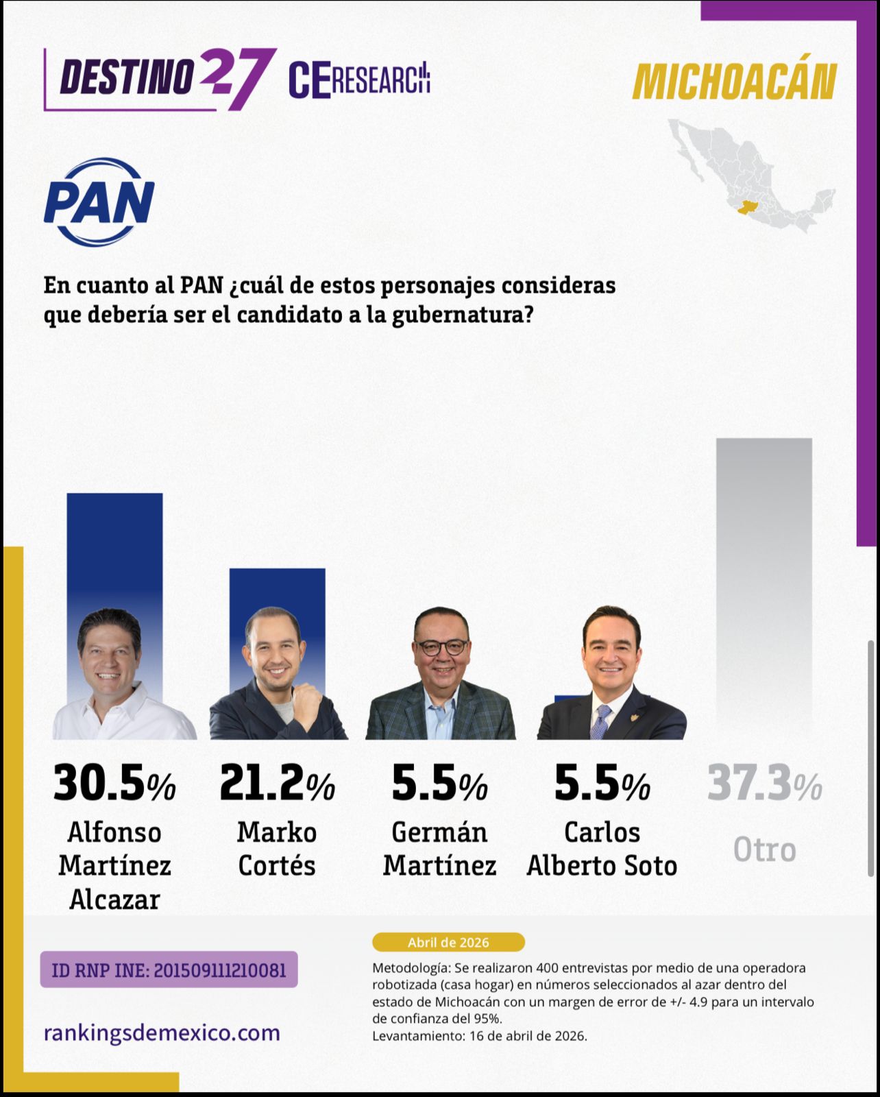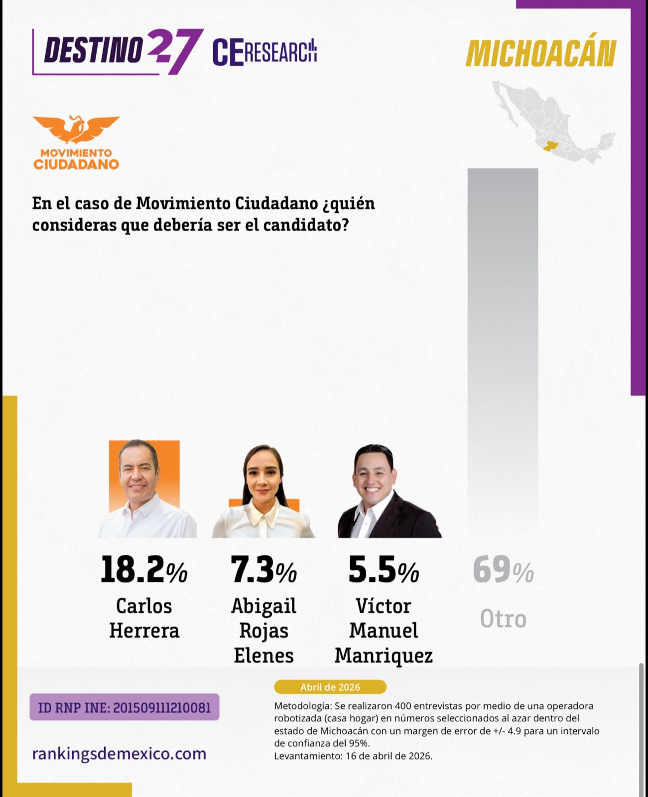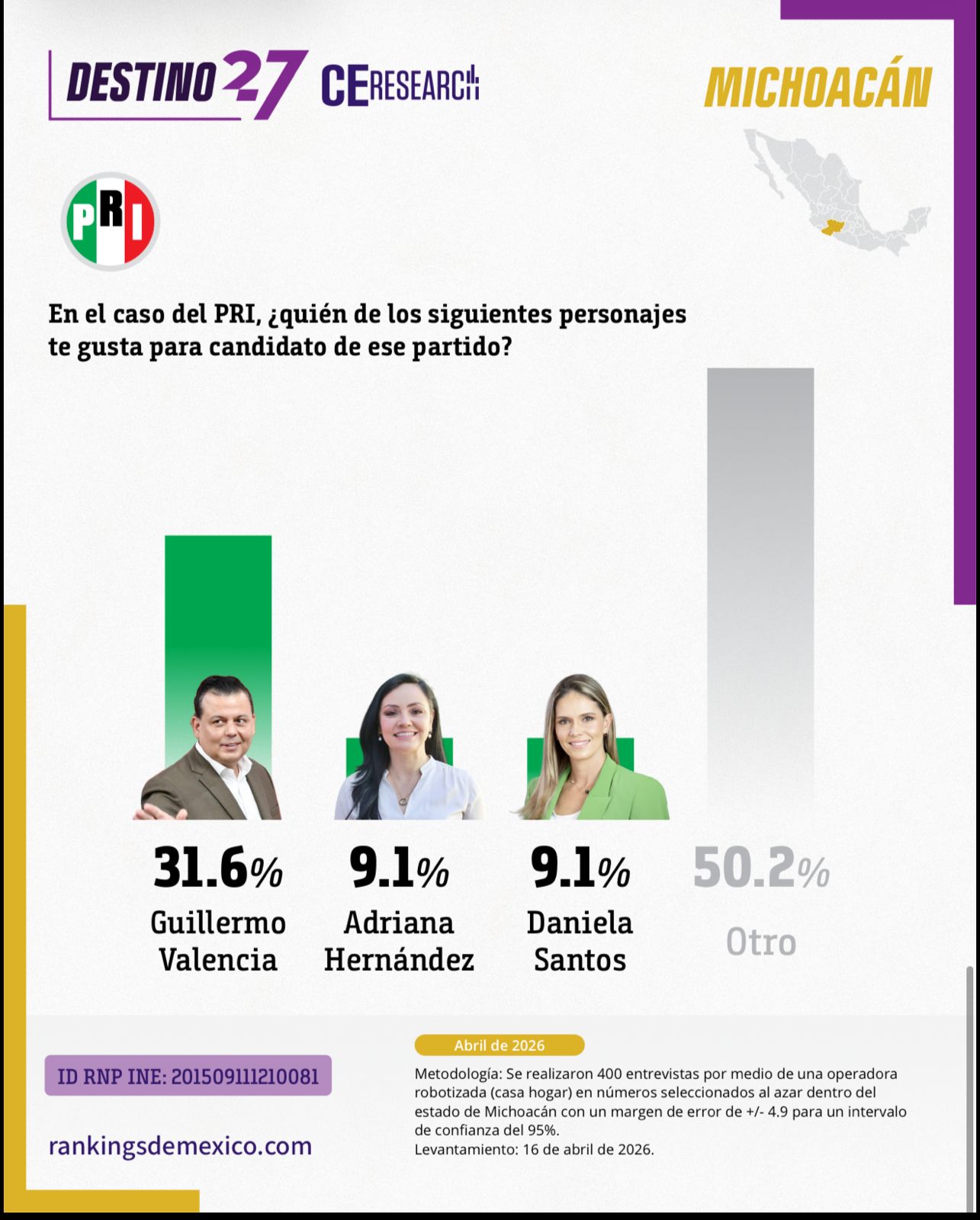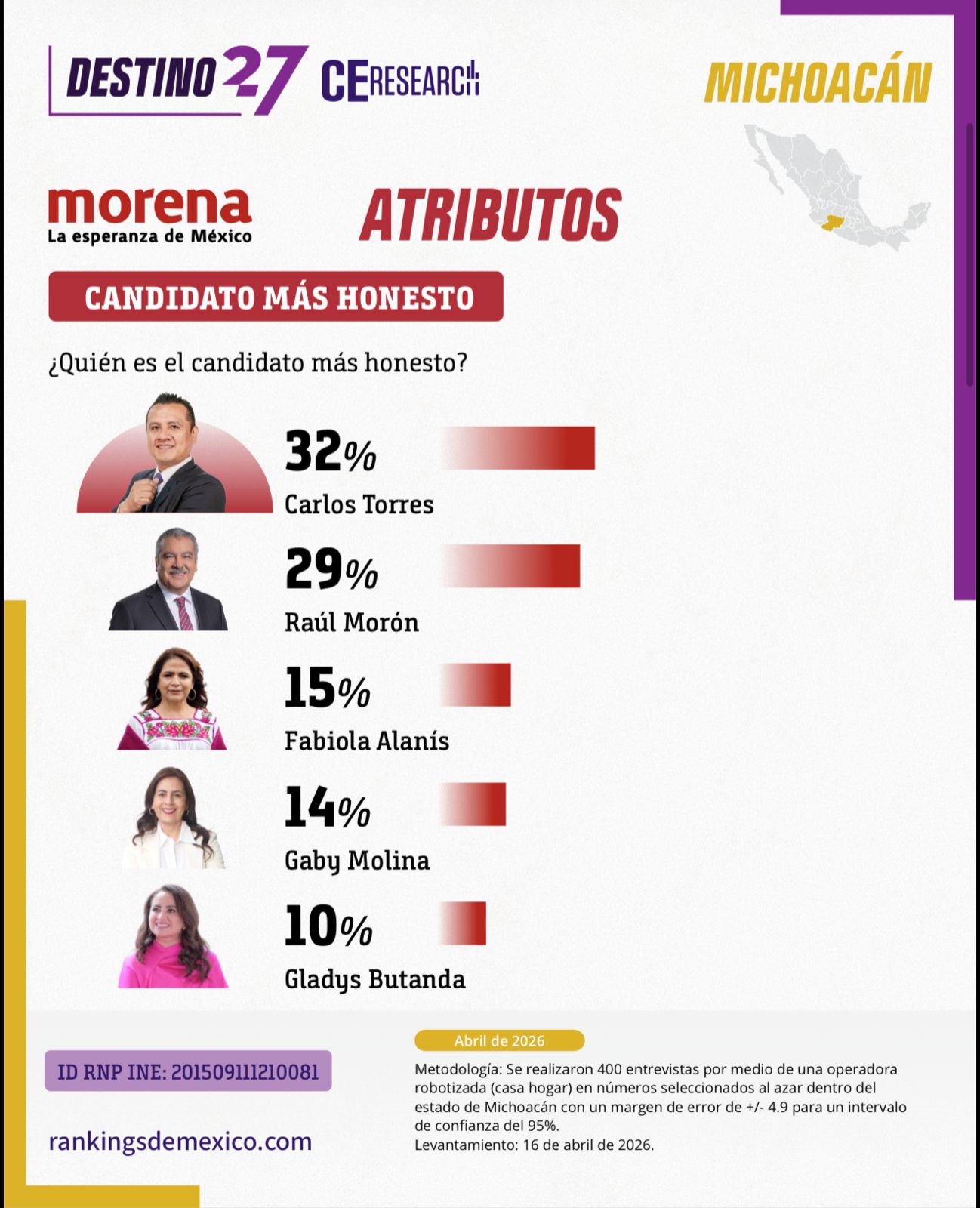 Una encuesta estatal levantada el 16 de abril de 2026 por la firma Rankings de México comienza a dibujar el escenario político rumbo a la elección de gubernatura en Michoacán, destacando posicionamientos, atributos y posibles careos entre aspirantes.