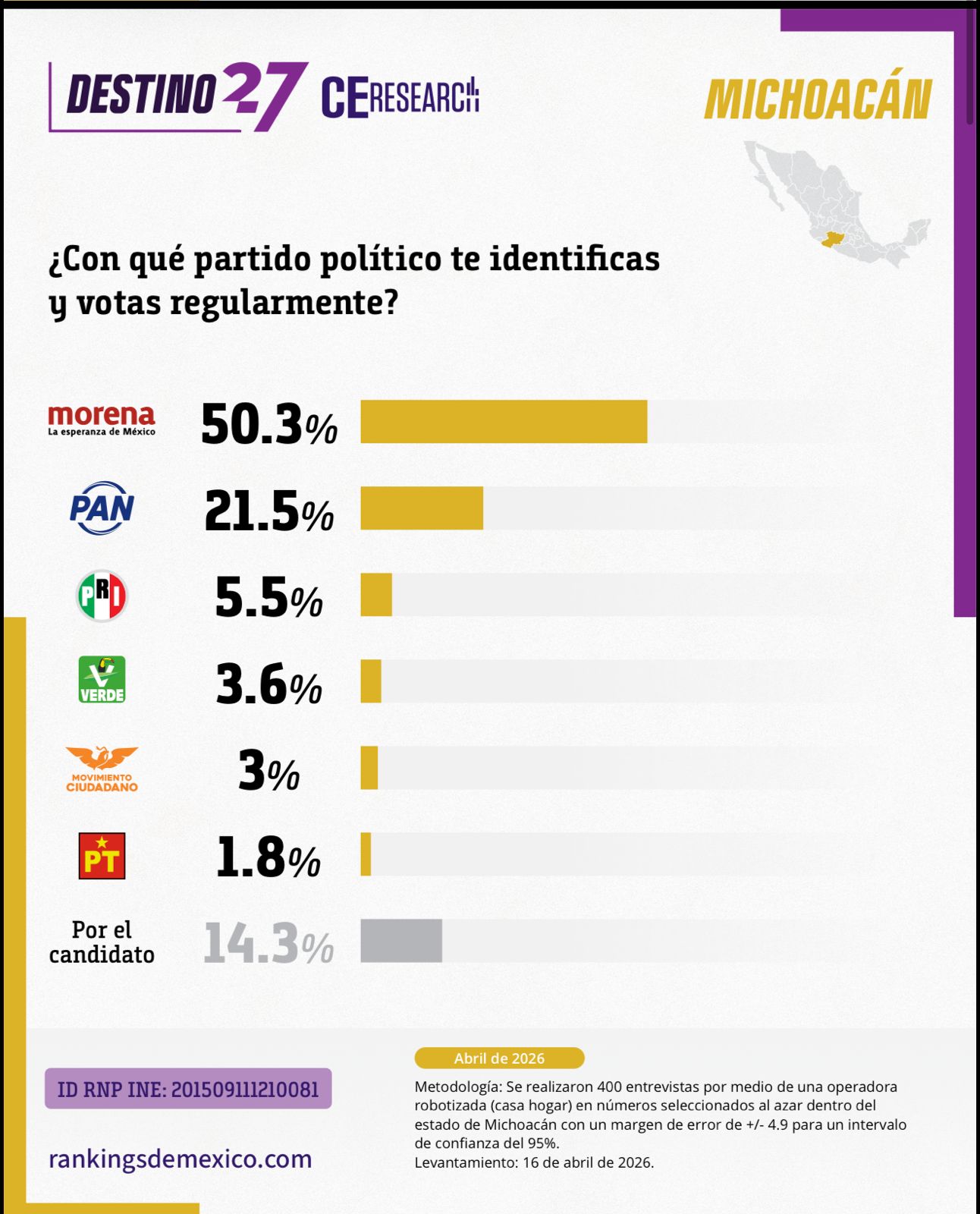 De acuerdo con el estudio —basado en 400 entrevistas telefónicas con un margen de error de ±4.9%—, el partido con mayor identificación entre la ciudadanía es Morena, con 50.3%, muy por encima del resto de las fuerzas políticas.