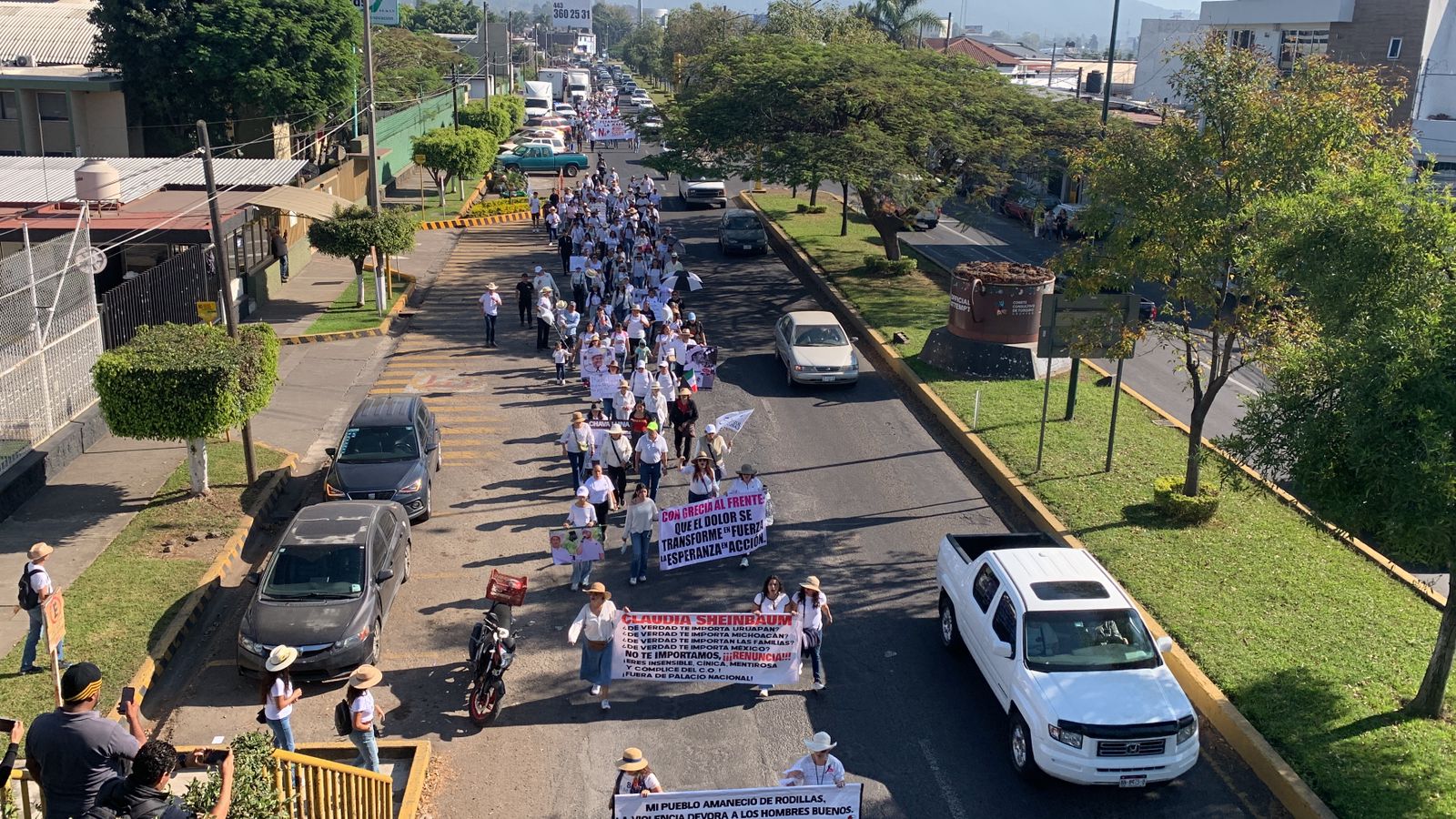 La primera marcha pacífica salió desde la esquina del Boulevard Industrial y el Libramiento Oriente, con la participación de unas 100 personas, que traían cartulinas y lonas con mensajes que exigían justicia para Carlos Manzo y seguridad para los ciudadanos, así mismo lanzaban consignas contra el partido político en el poder y los titulares de los gobiernos estatal y federal.
