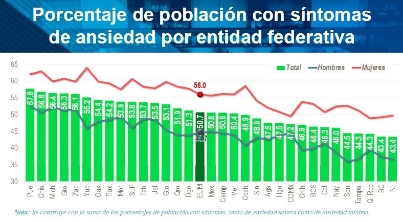 En cuanto al tema de la ansiedad, el mismo INEGI, informa que el 56.4 de la población en la entidad; de acuerdo a la Secretaría de Salud del Gobierno Federal, algunos síntomas son: