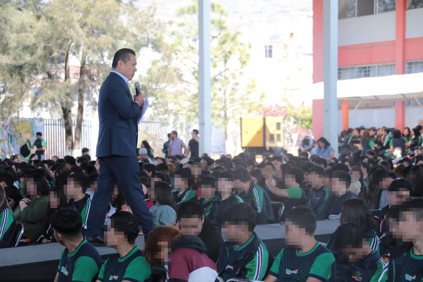 Morelia, Mich.- Con un llamado firme a la corresponsabilidad social para prevenir la violencia desde los entornos digitales, la Fiscalía General del Estado de Michoacán (FGE) llevó a cabo el foro “Desconek-tate, Reconek-tate” en el CECYTEM No. 12, como parte de las acciones estratégicas enfocadas en la protección de niñas, niños y adolescentes.